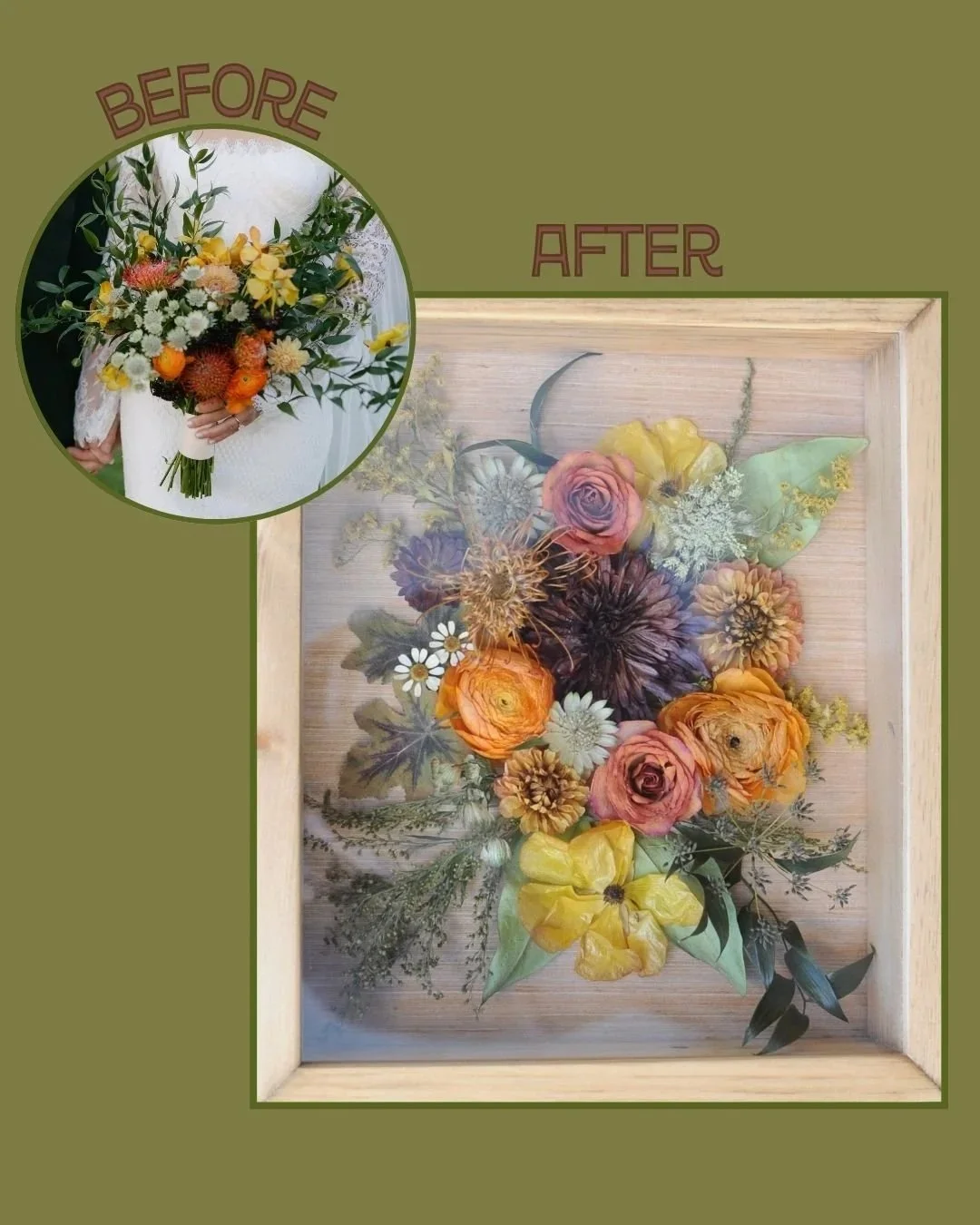 This is a 3D piece that keeps your flowers’ natural shape and detail. Great for petite displays, such as a corsage or memorial, that highlight your flowers just as they bloomed and provide the perfect keepsake for any home!